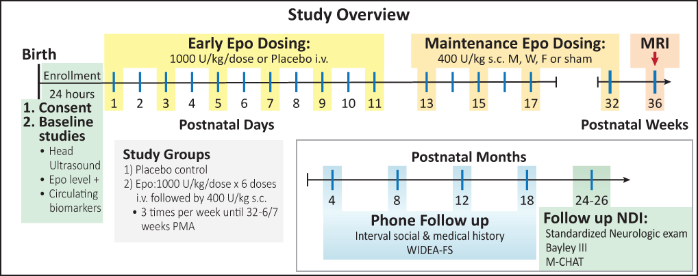 940 babies will be enrolled at 16 centers across the US. Half of the babies enrolled in the study will get standard care plus Epo, and half will get standard care plus a placebo (an inactive substance with no medicine). Babies will be followed every 4 months by phone contact until they are 2 years old, and tested in person at 2 years of age to see how they are developing.